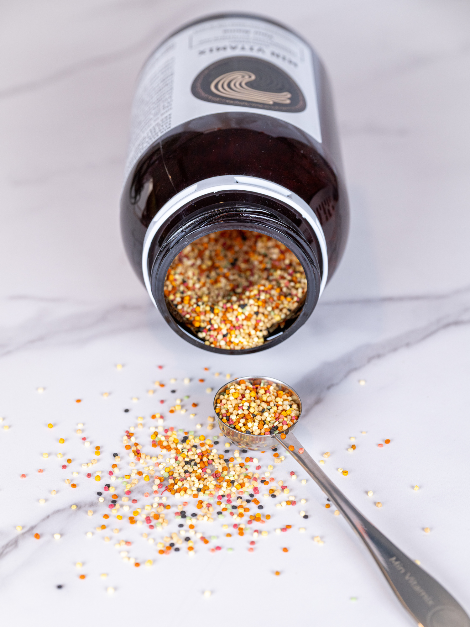 If your personal vitamin dosage (see your personalised vitamin bottle label) is higher than 2 spoons per day, start with taking ½ spoon of your custom vitamins in the morning and in the evening, gradually increasing over 10-14 days to the recommended intake of your personalised supplements.