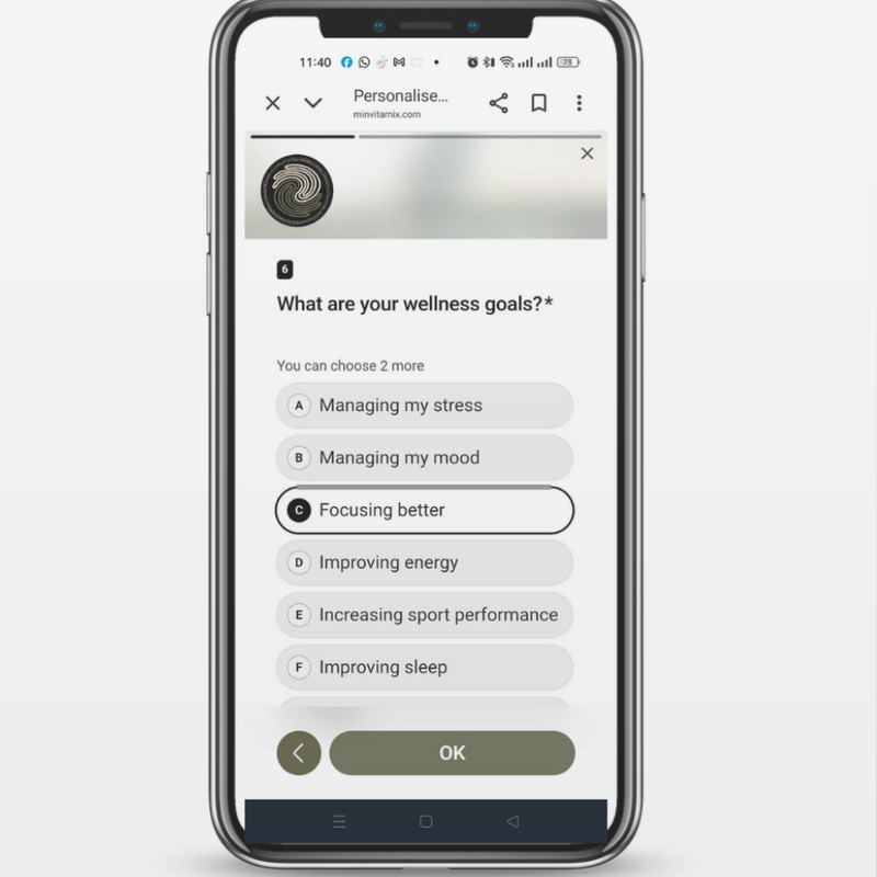 Created by certified nutritionists and backed by leading professors and doctors, Min Vitamix’s free lifestyle questionnaire analyses your health across multiple factors — including diet, stress, sleep, and overall wellness. Using your responses, our smart algorithm determines your body’s unique vitamin and mineral requirements, just like a vitamin and mineral test, and provides you with personalised results at the end.